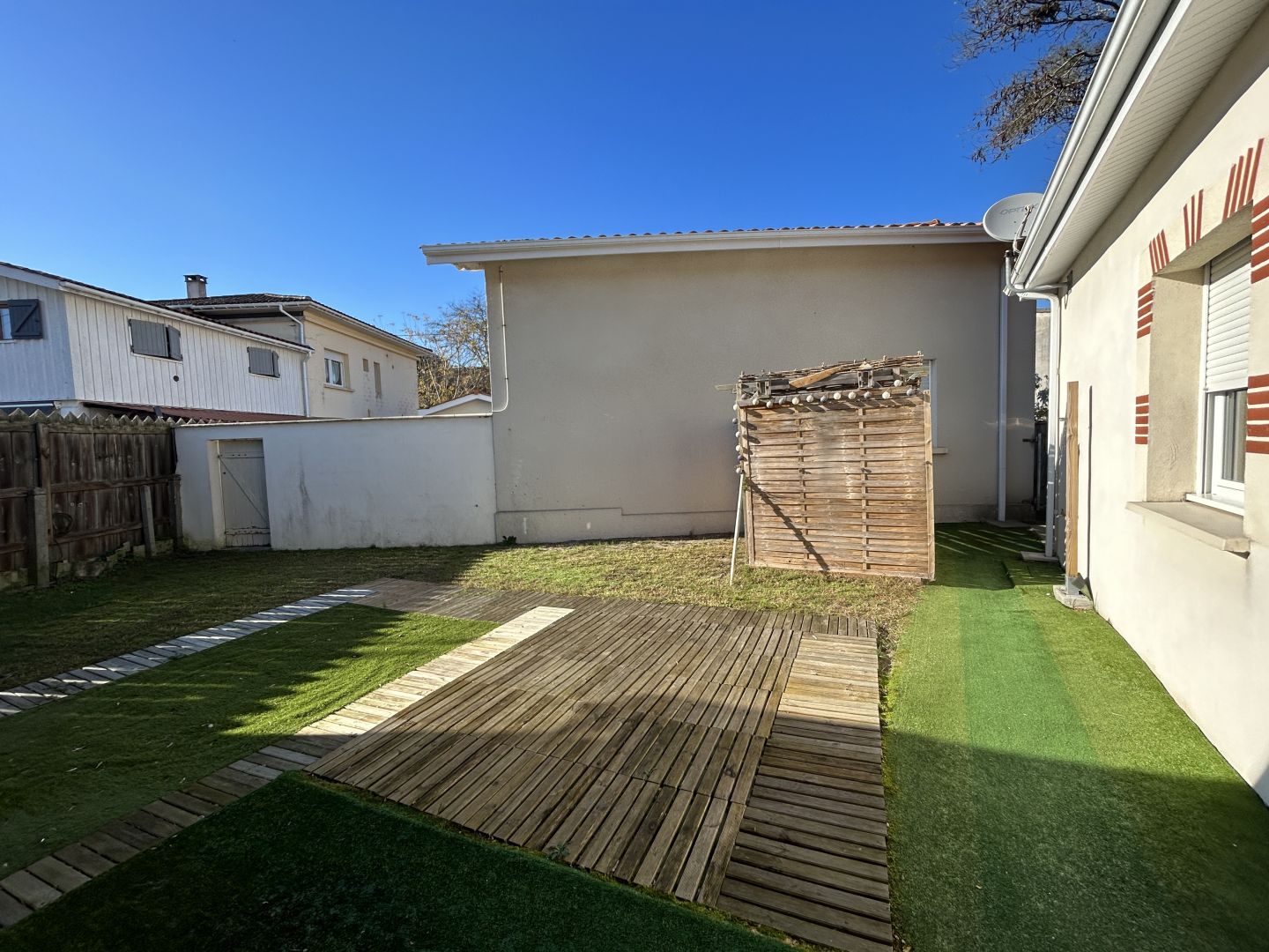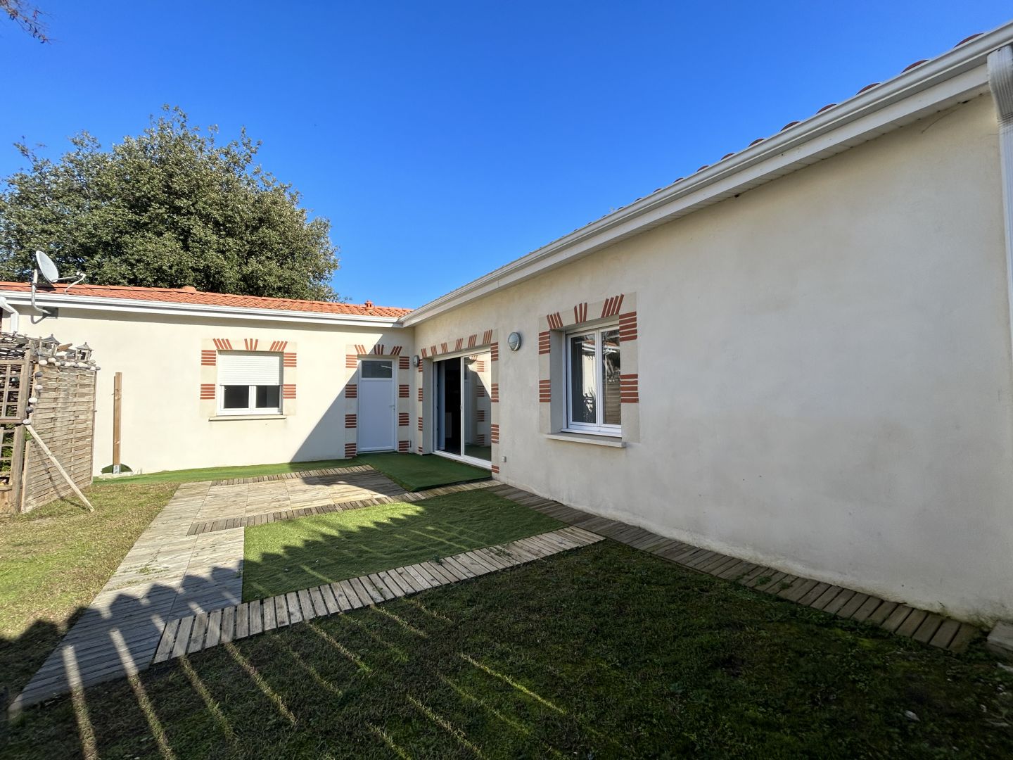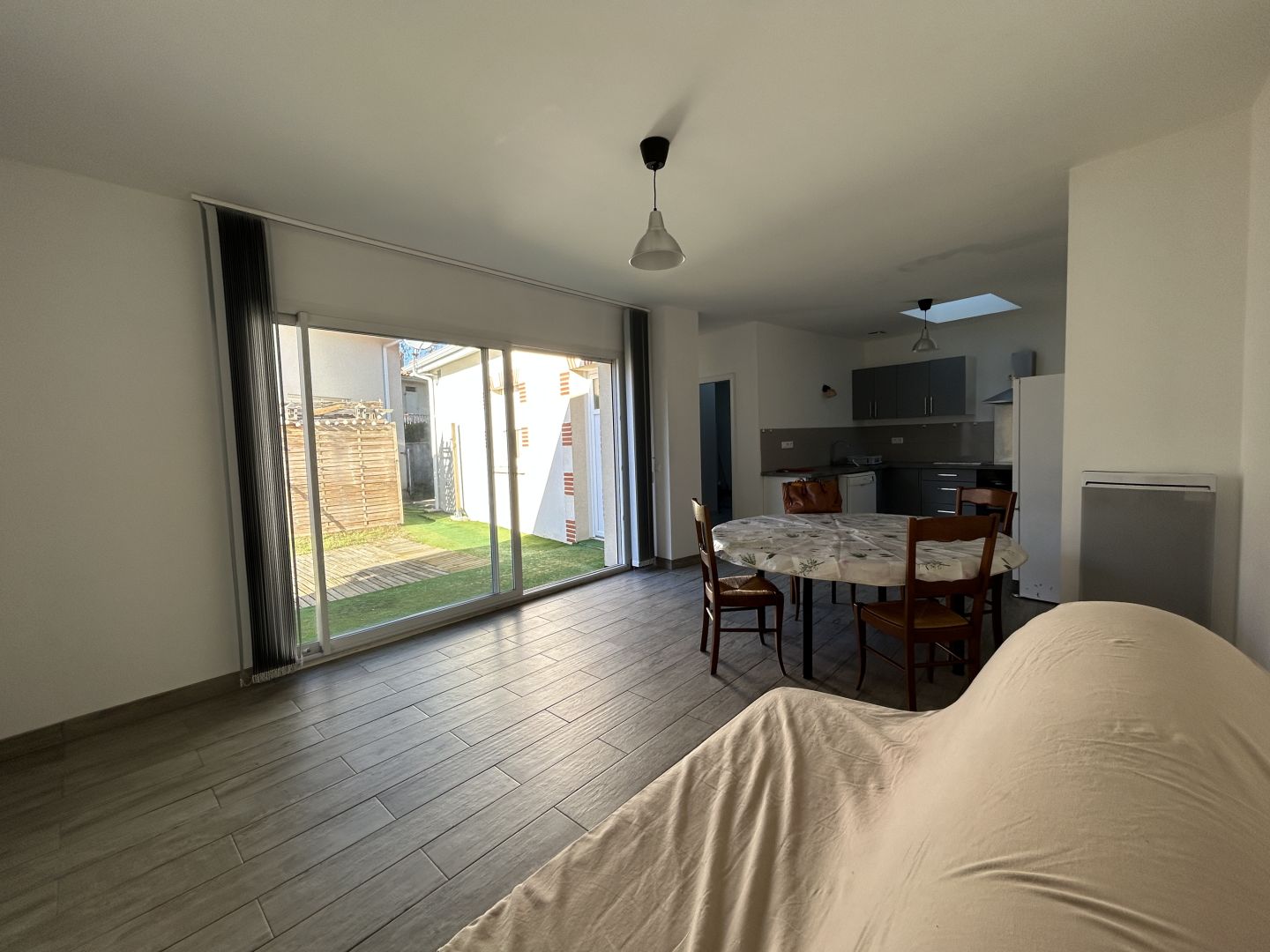 SOULAC SUR MER - A seulement 500m du centre ville, cette maison de plain pied T3 meublée, d'une surface d'environ 66m2 est composée d'une entrée, un salon/séjour lumineux avec baie vitrée, une cuisine américaine ouverte et équipée (plaque de cuisson, hotte, four,réfrigérateur). Elle dispose de deux chambres avec rangements, une salle d'eau et WC séparé. A l'extérieur, un petit jardin privatif d'environ 150m2 et un abri jardin. Maison à louer à l'année, meublée. Disponible immédiatement. Loyer : 750,00€ par mois hors charges. Dépôt de garantie : 1500€ (2 mois car meublé) Honoraires à la charge du locataire : 490€
